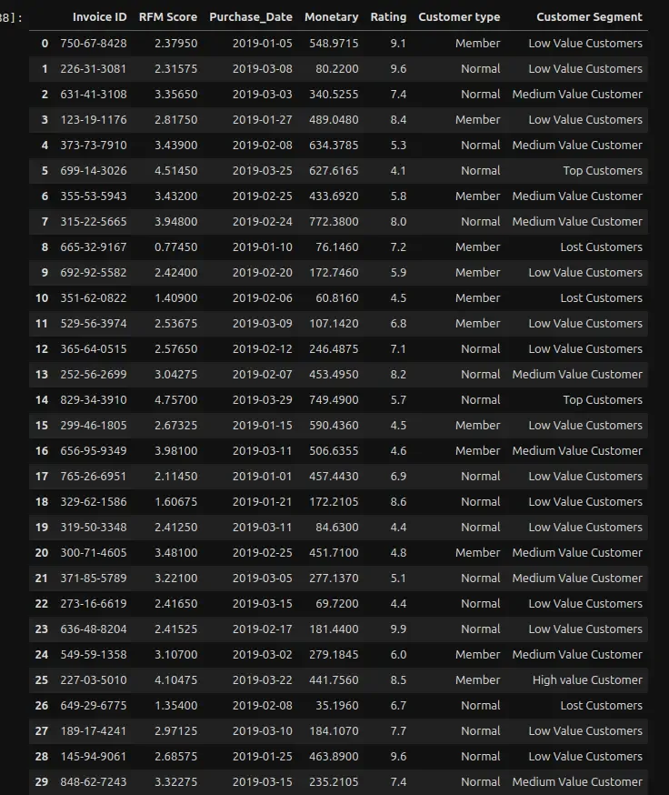 final_data = merged_data[['Invoice ID', 'RFM Score', 'Purchase_Date', 'Monetary', 'Rating', 'Customer type']]