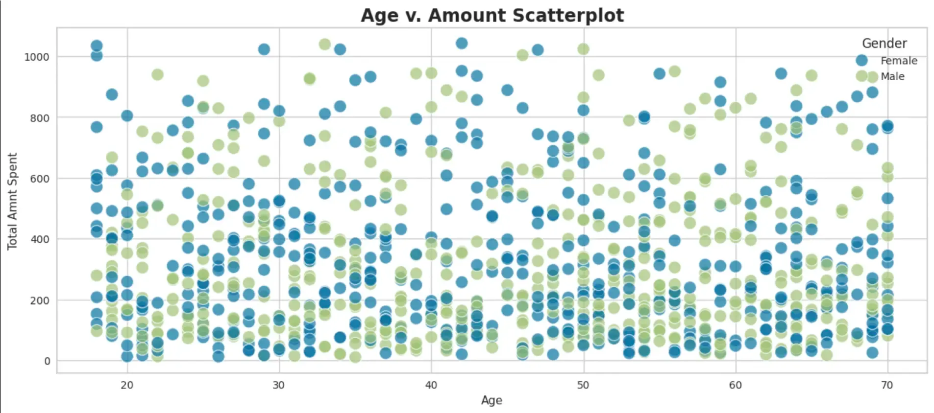 - Scatter plot to see initial spread of Amount spent across different age groups.