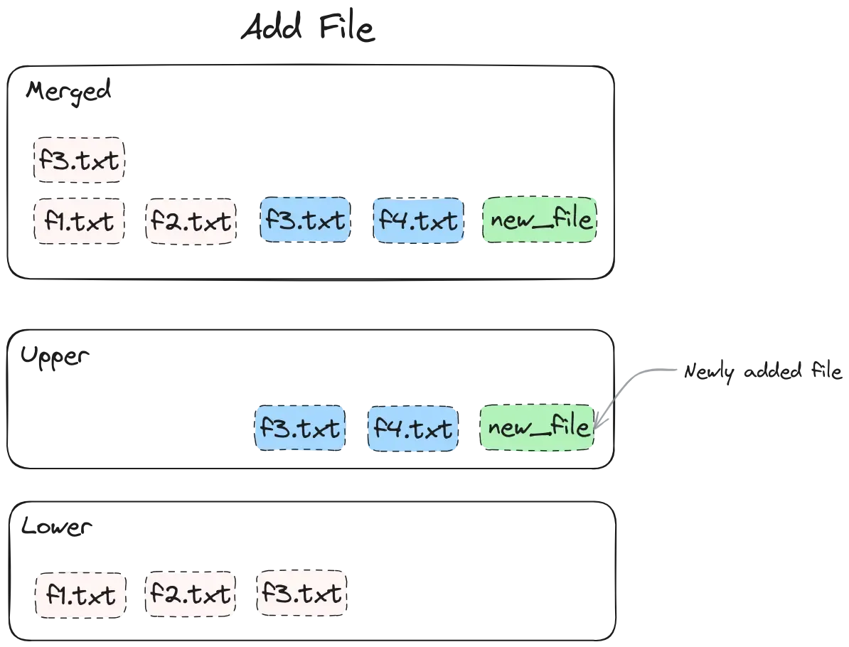 When a process reads a file, the overlayfs filesystem driver looks in the upper directory and reads the file from there if it’s present. Otherwise, it looks in the lower directory. When a process writes a file, overlayfs will just write it to the upper directory.