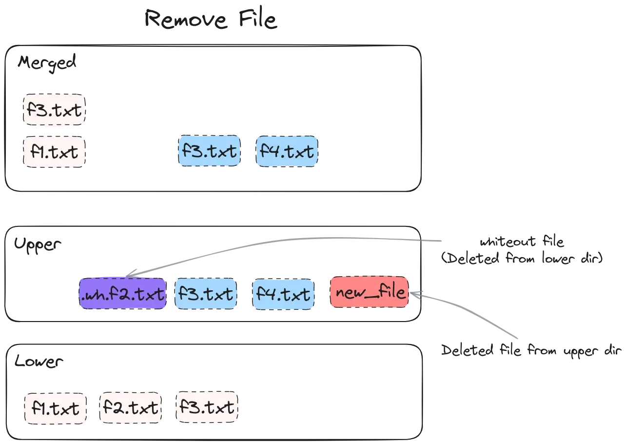Removing a file from the OverlayFS directory will successfully remove a file from the upper directory, but if the file belongs to the lower directory, OverlayFS will simulate that removal by creating a whiteout file.