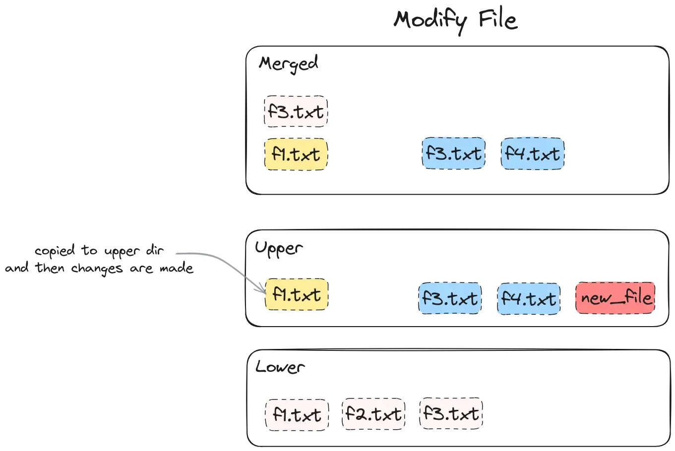 When files at the bottom layer are about to be modified, since the bottom layer is accessed read-only, they first need to be copied into the top layer. This operation is commonly referred to as copy-up.