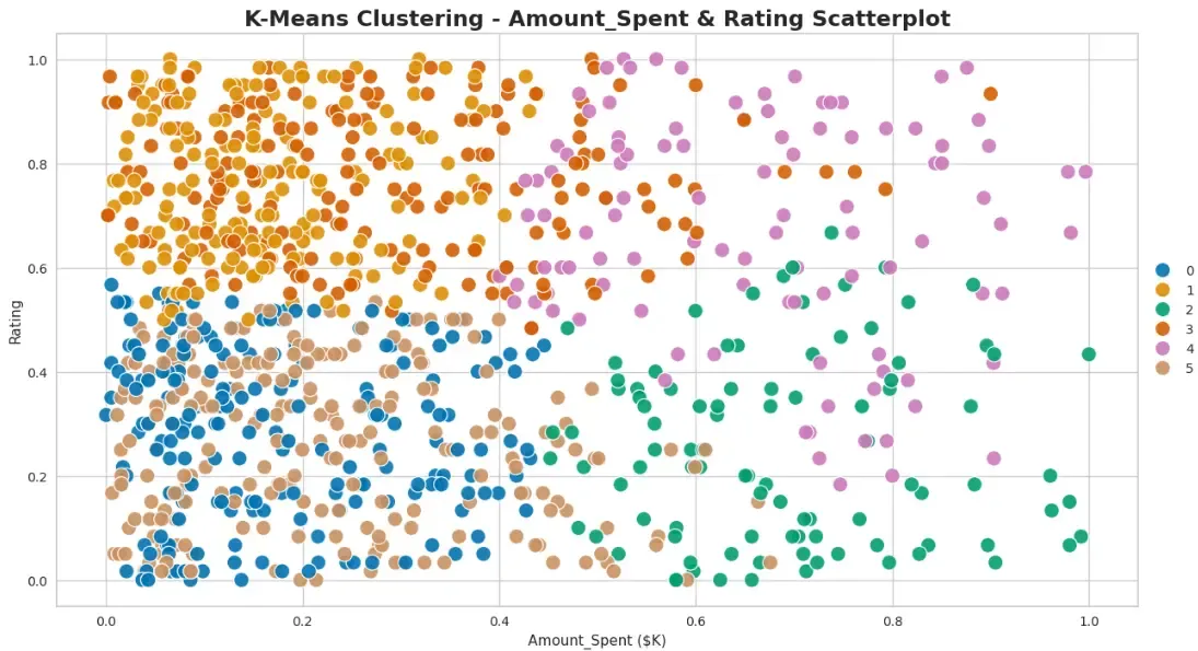 Cluster 5 (light green) — On the above plot, we see that Cluster 5 (light green) is a valuable segment as they have spent the maximum amount of money on products (in the range of $800-$1000) and also have given high ratings to bought items. They also tend to be the older generation in the age group of 45 yrs-70 yrs.