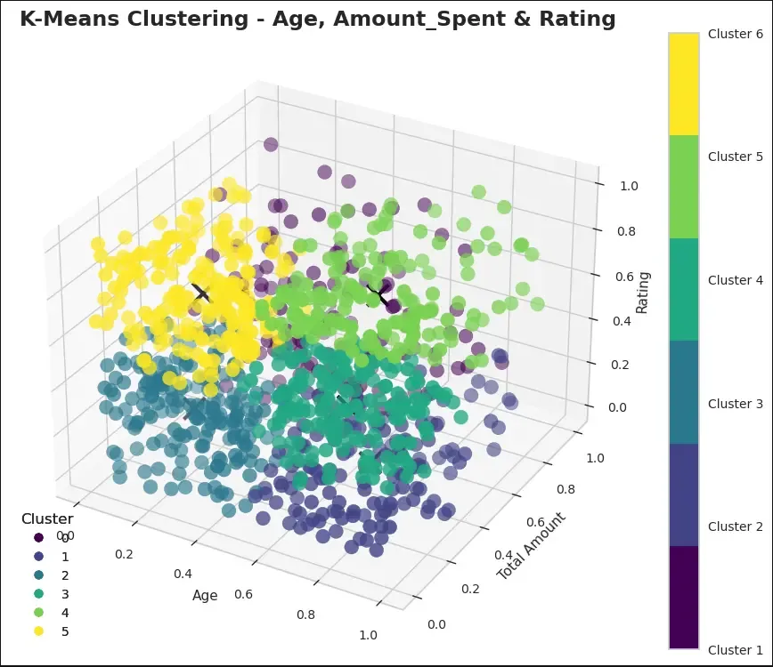 Cluster 1 (dark purple) — this cluster is slightly hidden at the back of the plot, but this segment is also a high spender who bought expensive products in the range of $700-$1000. They are the younger adults. Ratings provided by them are low, hence scope of improvement exists by taking customer surveys/feedback from this segment on the products purchased.
