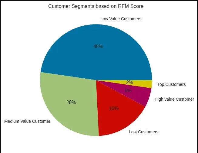 We see that 48% of the customers in this dataset had a score between 3/5 and 1.6/5, as low-value customers. The combination of this score is determined by the Recency of purchase and Monetary value spent.