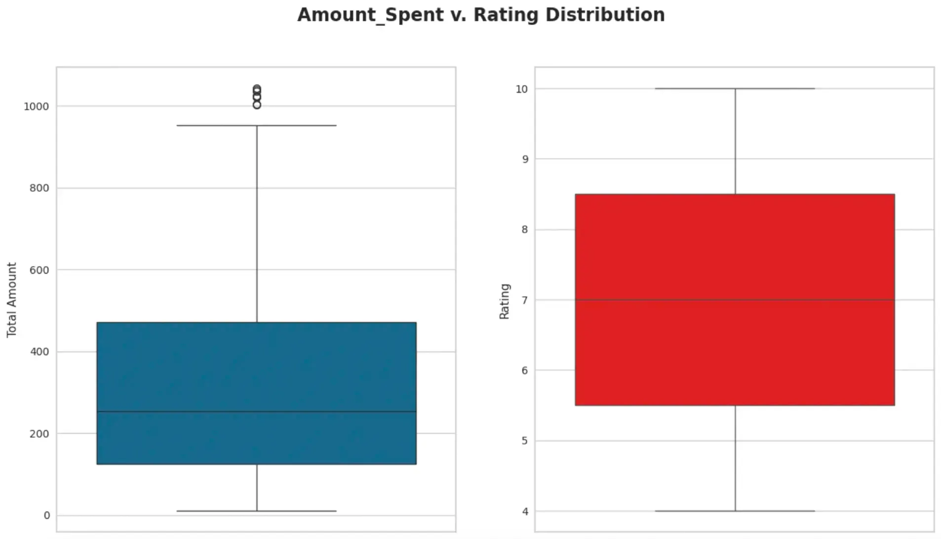 - Box plot to see distribution of amounts and spending - Mentions that mostly all customers spent in the range of 150 USD-450 USD on products, with a few outliers spending over $1000. Average customer ratings range from 5.5/10 - 8.5/10