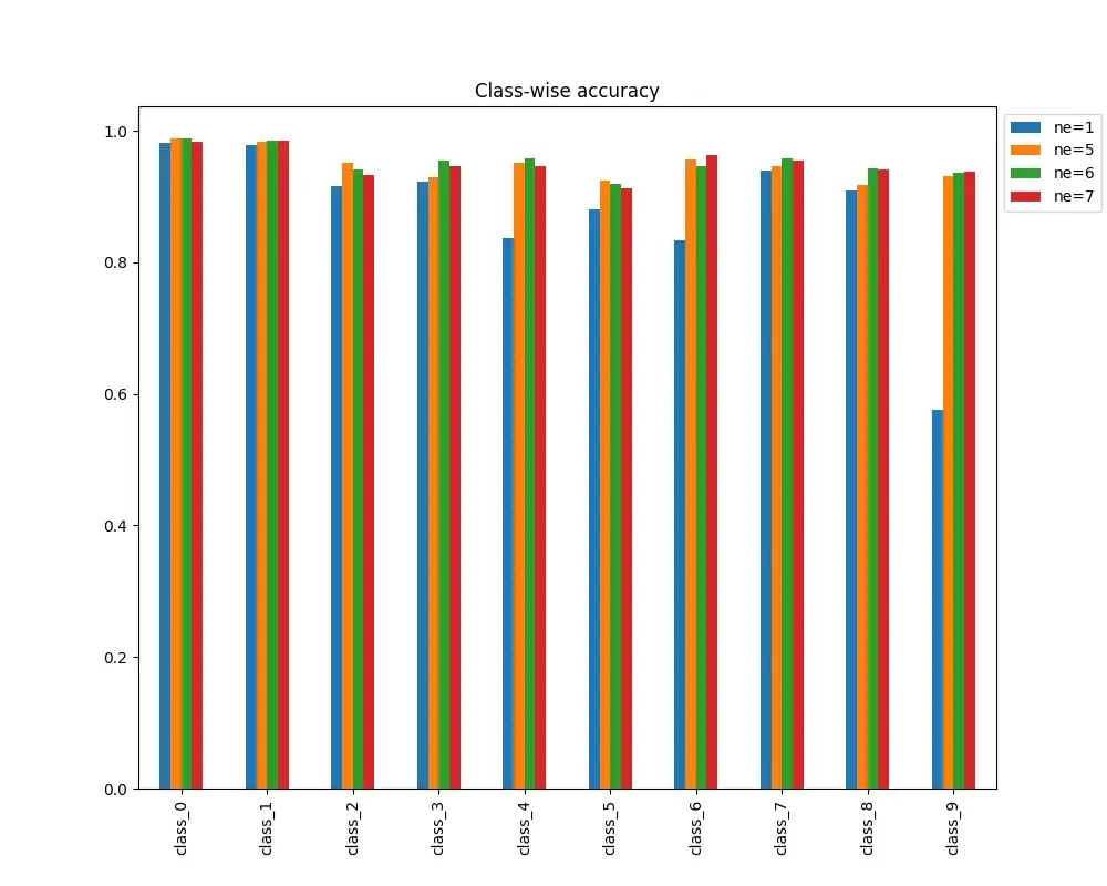 Let’s take a look at the classwise accuracy for different number of experts and compare to base model (with ne=1).