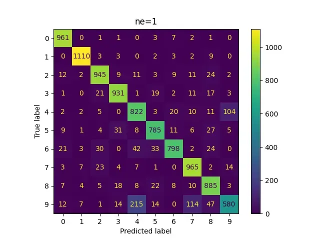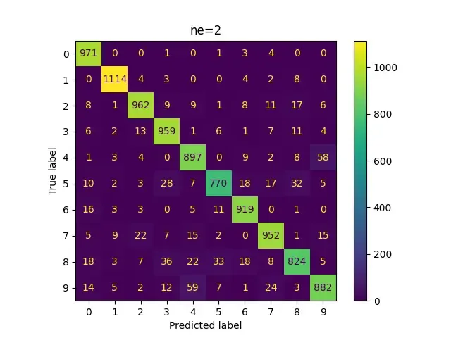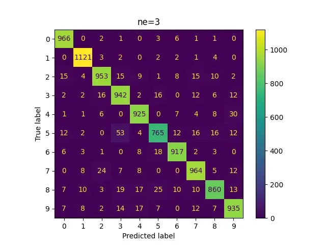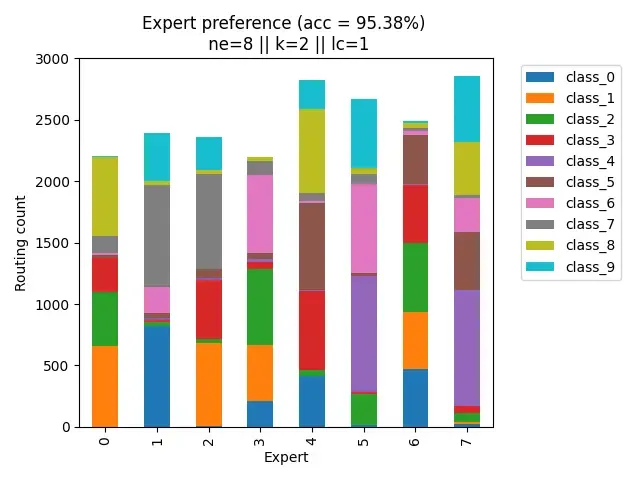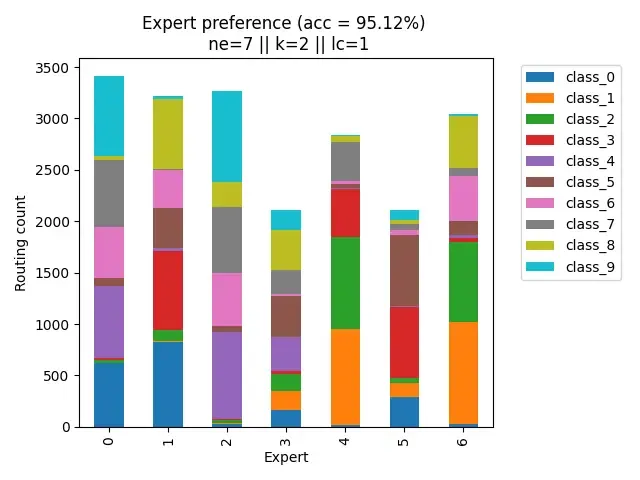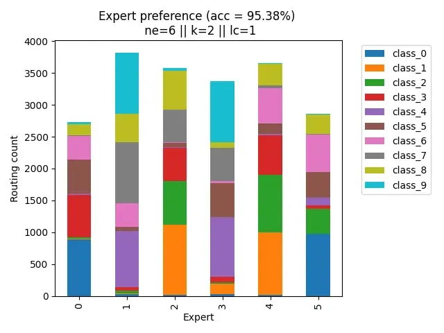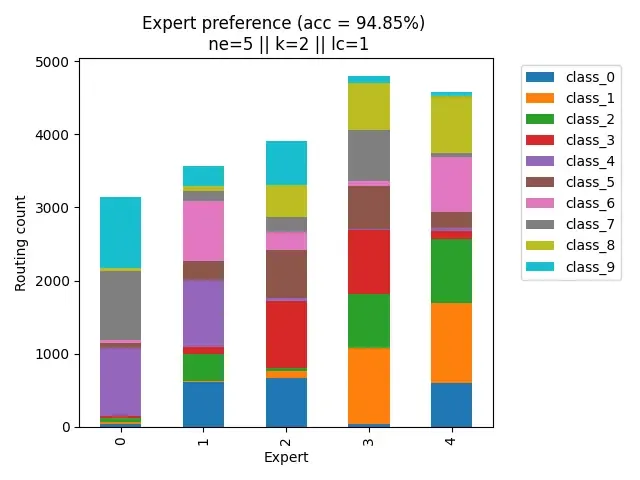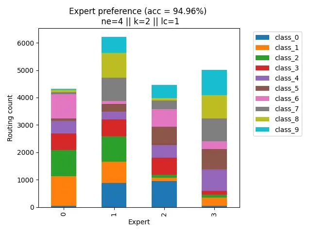 Now we see specializations starting to occur. Most samples from each class are now being divided between 2-3 experts. This is also likely why we see a prominent jump in performance from ne=3 ($\approx$ 93.5%) to ne=4 ($\approx$ 95%)!