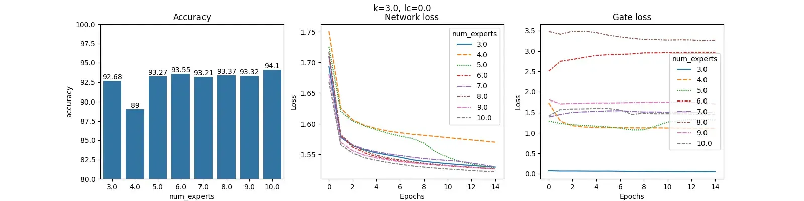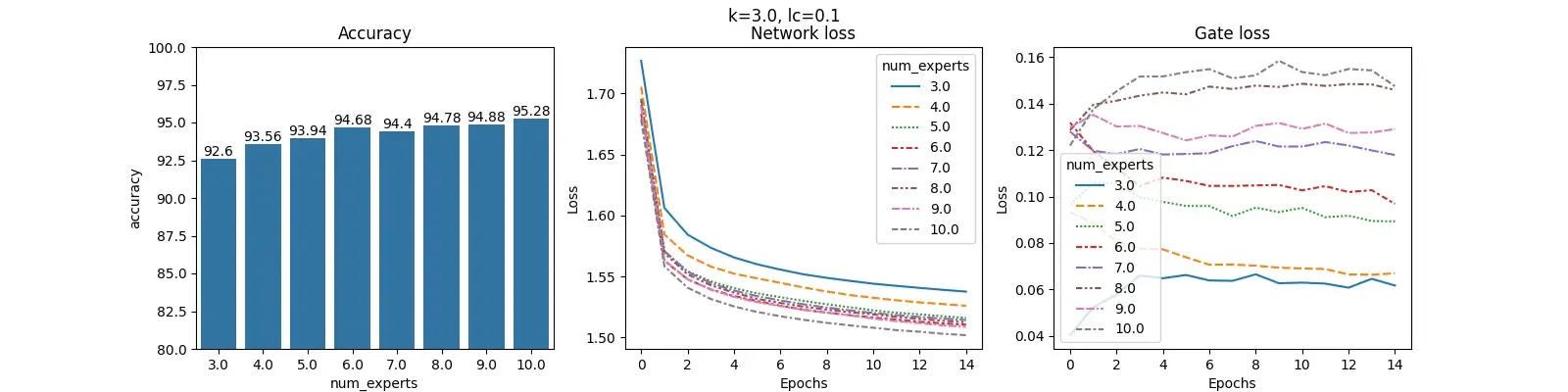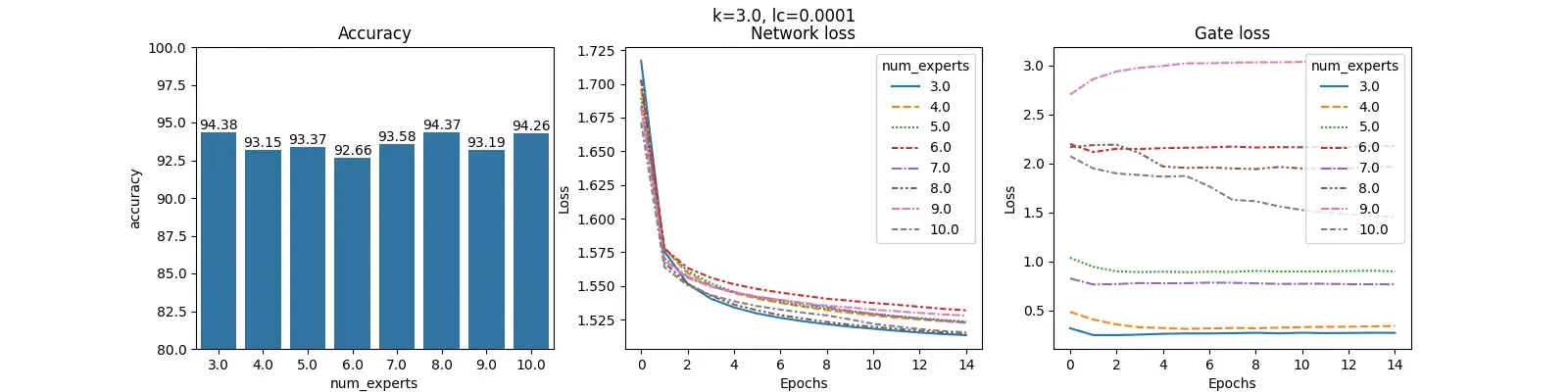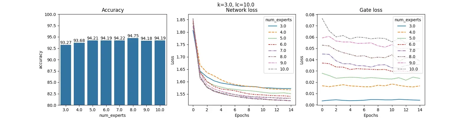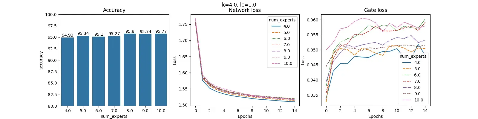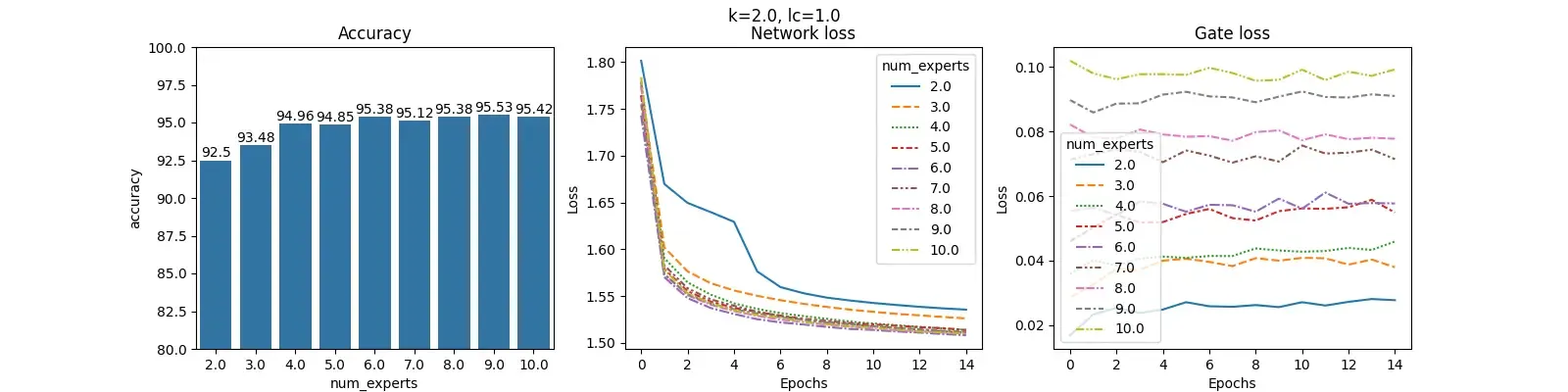 For each value of $lc$ and fixed $k$, we construct 3 plots: Accuracy, Network loss and Gate loss. The plot for Accuracy shows the overall accuracy of the MOE on the test set for different number of experts. The plot for Network loss shows the changing values of the Network loss during training. Similarly, plot for Gate loss shows the changing values of Gate loss during training.