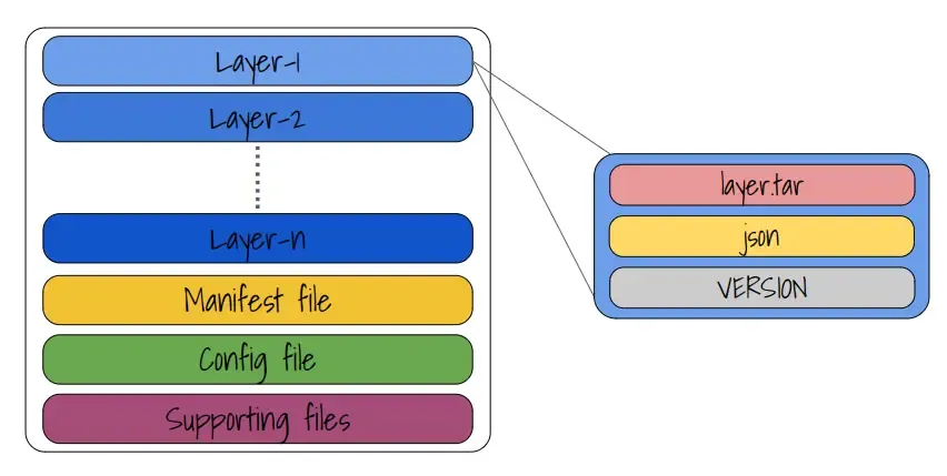 Config file is a json object containing all information regarding image (e.g. History, Intermediate container config, etc.). The name of this file is a sha256 hash, the same as image_id in the local image registry. Here’s the content of the config file.